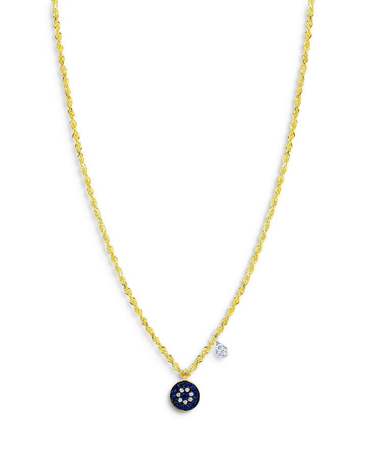 This Blue Sapphire & Diamond Dangle Pendant Necklace by Meira T features a blue sapphire and diamond evil eye, accented by a dangling diamond pear, creating a protective and stylish design.