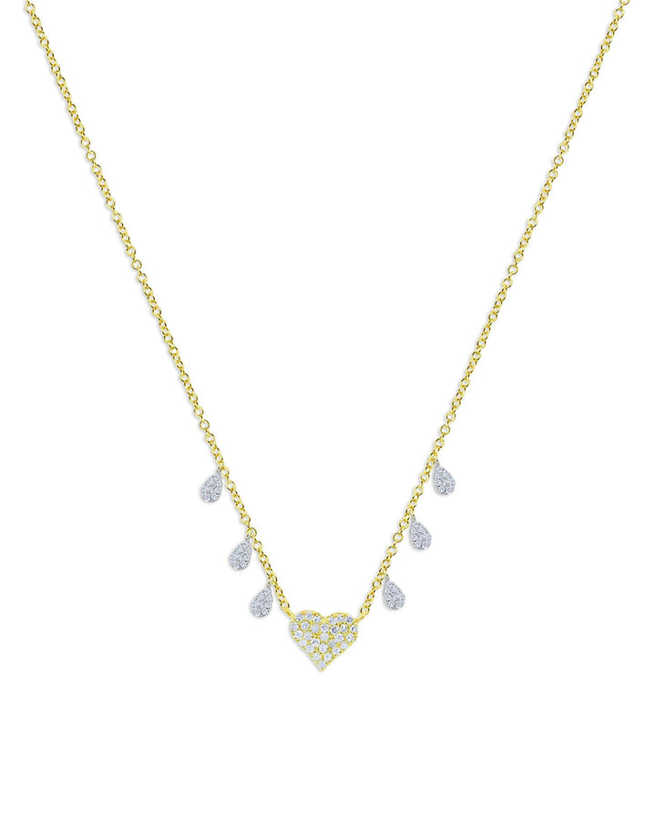 This Diamond Pavé Heart & Dangle Pendant Necklace by Meira T features a stunning diamond pavé heart, with glistening diamond dangles, adding elegance and sparkle to the two-tone design.