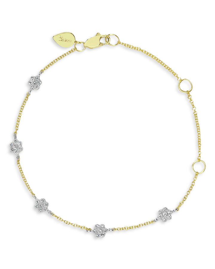 This 14K Yellow Gold Diamond Flowers Bracelet by Meira T features charming diamond flower motifs stationed along a polished chain. Its delicate and feminine design makes it perfect for adding a touch of sparkle to any outfit.