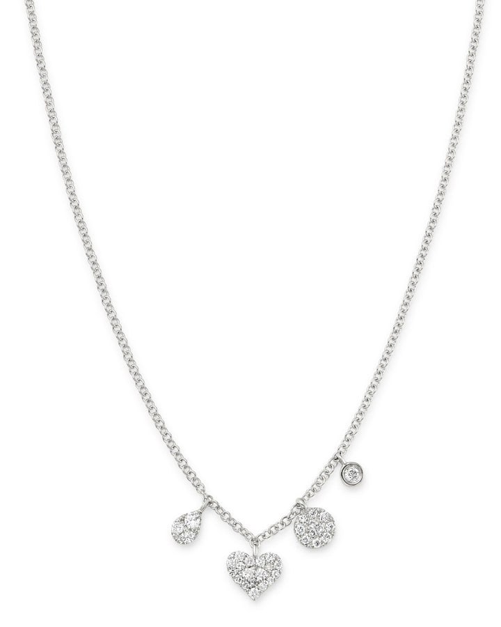 This 14K White Gold Diamond Charm Necklace by Meira T features an array of diamond-encrusted charms, including tear, heart, round, and bezel designs, hanging from a delicate white gold chain. The combination of these symbols and the sparkle of diamonds adds a playful yet sophisticated touch to any outfit.