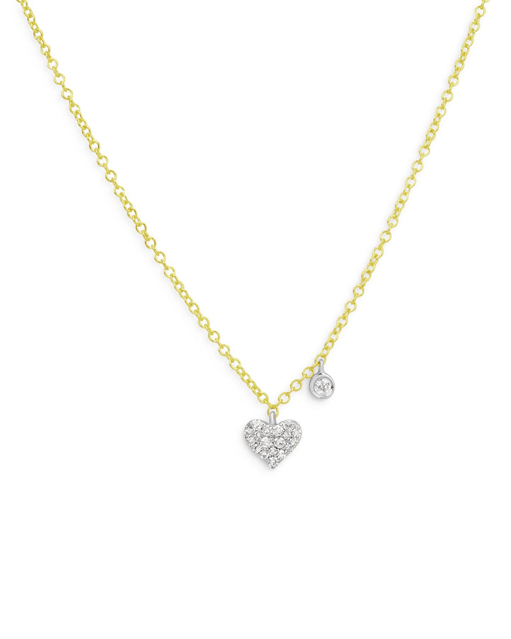 This 14K Yellow Gold Diamond Heart Pendant Necklace by Meira T features a delicate diamond heart and circle pendant, gracefully hanging from a simple gold chain. The combination of the heart and circle creates a timeless and elegant design, making this necklace perfect for layering or wearing alone for a refined, romantic touch.