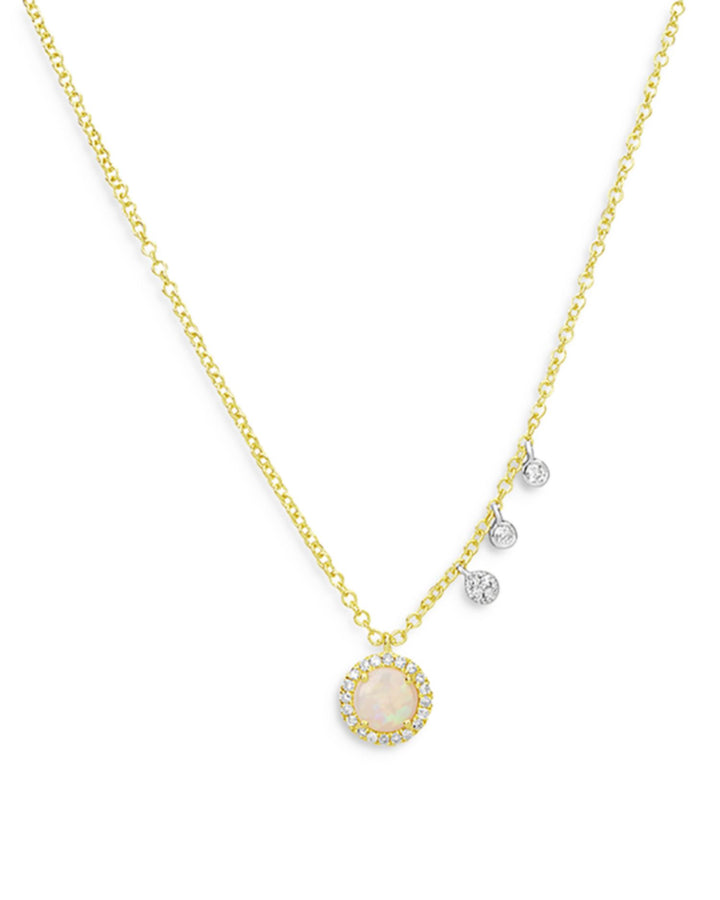 This 14K Yellow & White Gold Diamond & Opal Necklace by Meira T features a simple chain with an opal pendant and asymmetric bezel diamond charms. The striking combination of the iridescent opal and the sparkling diamonds creates a delicate yet elegant design, making this necklace perfect for adding a touch of color and sophistication to any outfit.
