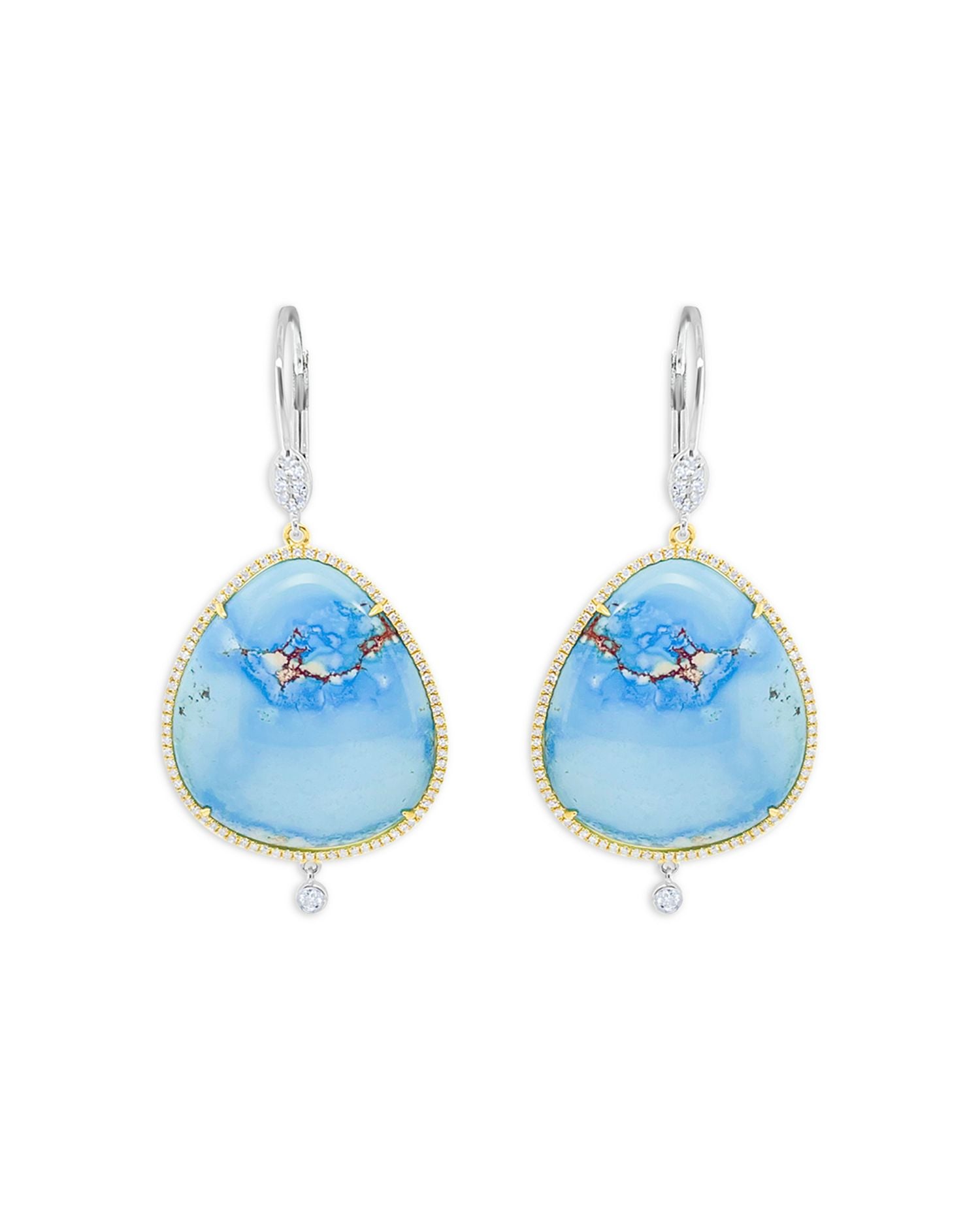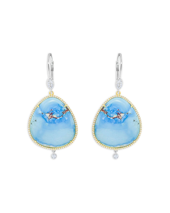 These 14K Yellow Gold White Topaz & Diamond Halo Dangle Huggie Hoop Earrings by Meira T feature vibrant turquoise stones highlighted with sparkling diamonds. The combination of two-tone gold and the stunning contrast of turquoise and diamonds makes these earrings an eye-catching statement piece, perfect for those who love bold, colorful jewelry with an elegant touch.
