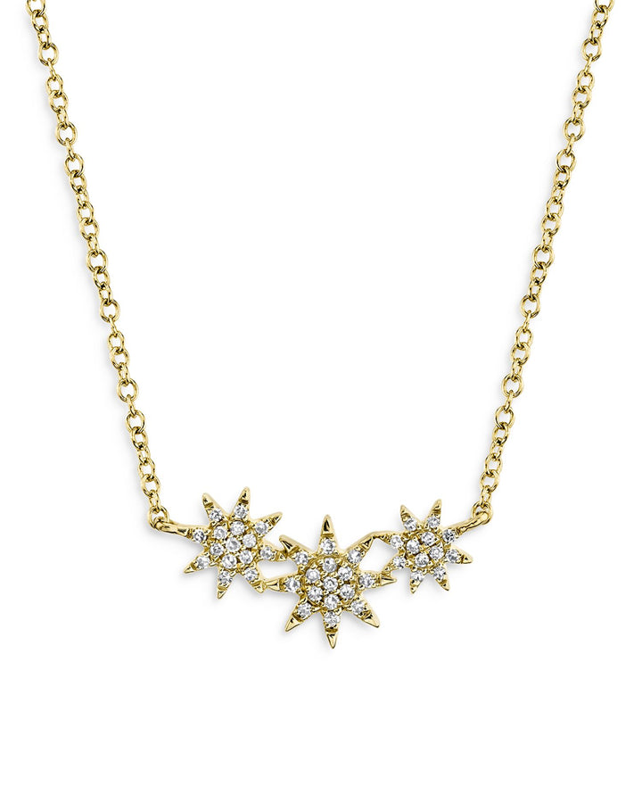 This Diamond Star Pendant Necklace in 14K Yellow Gold by Moon & Meadow features three sparkling diamond-encrusted stars on a simple gold chain. The understated elegance of the stars adds a touch of celestial charm, making it a perfect piece for layering or wearing solo for a more delicate look.