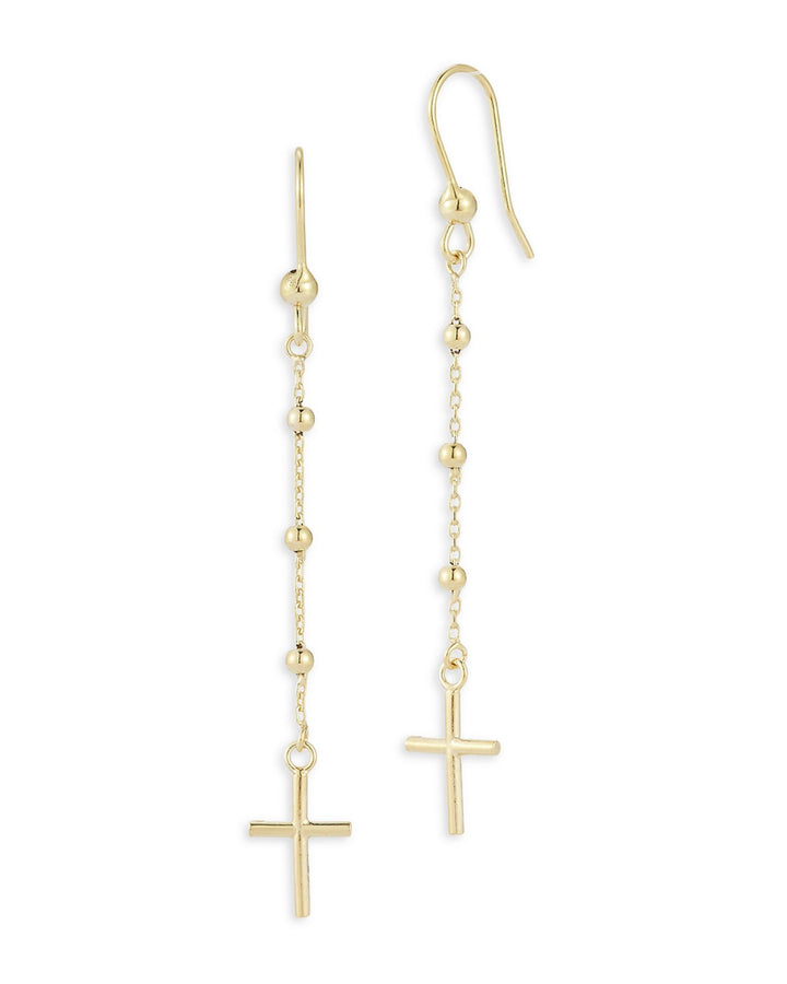 These 14K Yellow Gold Cross Rosary Drop Earrings by Moon & Meadow feature an elegant cross and bead rosary design, adding a spiritual touch to your jewelry collection. The delicate drop style creates a graceful movement, making these earrings perfect for adding an understated, meaningful accent to any outfit.