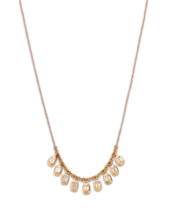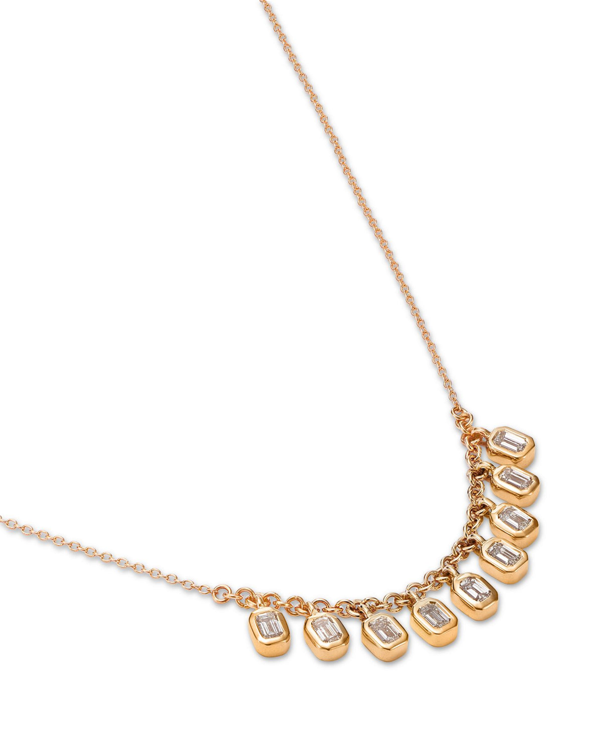 This 14K Yellow Gold Lab Grown Diamond Dangle Collar Necklace by Moon & Meadow features a stunning row of dangling emerald-cut lab-grown diamonds, making this necklace both elegant and show-stopping. The beautiful diamonds are set in 14K yellow gold, perfect for adding a touch of luxury to your look.