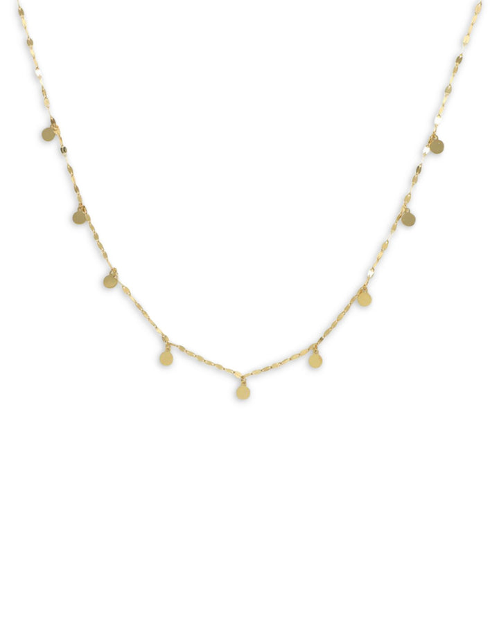 This 14K Yellow Gold Polished Disc Dangle Collar Necklace by Moon & Meadow features dangling polished discs that create a glamorous glow. The collar necklace design adds a bold yet elegant statement to any look, perfect for adding a sophisticated touch to both casual and formal outfits.