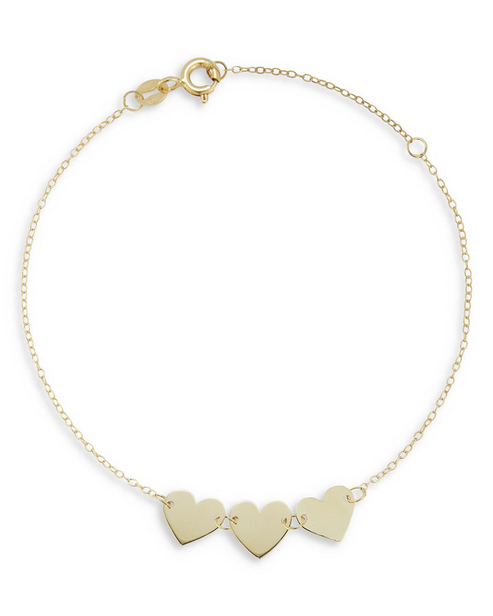 This 14K Yellow Gold Triple Heart Chain Bracelet by Moon & Meadow features three delicate hearts linked together in a charming chain design. The sweet hearts add a touch of romance and elegance, making this bracelet perfect for adding a meaningful and stylish accent to your wrist.