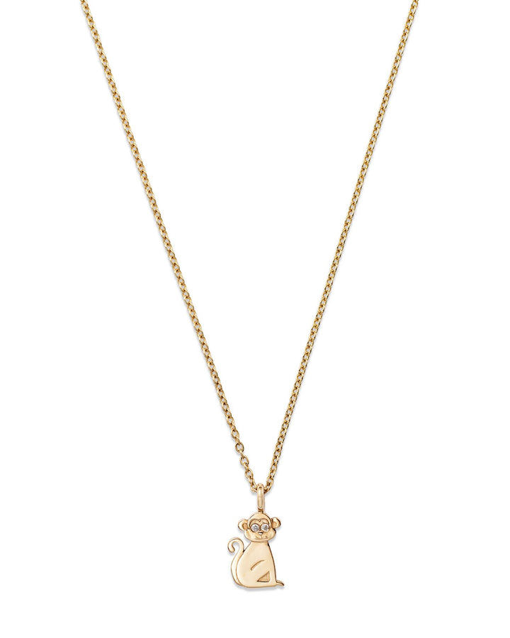 This 14K Yellow Gold Diamond Monkey Pendant Necklace by Moon & Meadow from the Menagerie Collection features a sweet monkey pendant with diamond accents. The playful design, combined with the sparkle of diamonds, creates a whimsical yet luxurious look. Perfect for those who love nature-inspired jewelry with a touch of elegance.