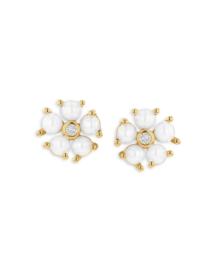 14K Yellow Gold Diamond & Pearl Flower Stud Earrings