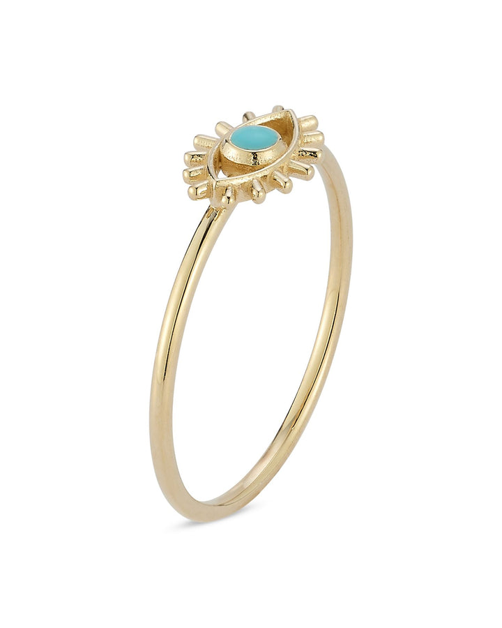 This 14K Yellow Gold Turquoise Eye Ring by Moon & Meadow features a striking turquoise stone at its center, forming the "eye" of the design. The combination of vibrant turquoise and yellow gold creates a bold and stylish statement piece.