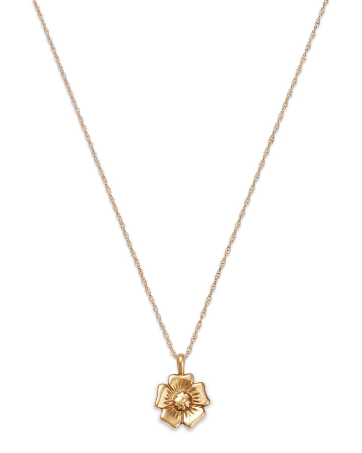 This 14K Yellow Gold Flower Pendant Necklace by Moon & Meadow features a beautifully detailed flower pendant, glowing elegantly on a fine yellow gold chain. The intricate design adds a touch of nature-inspired sophistication to any outfit.
