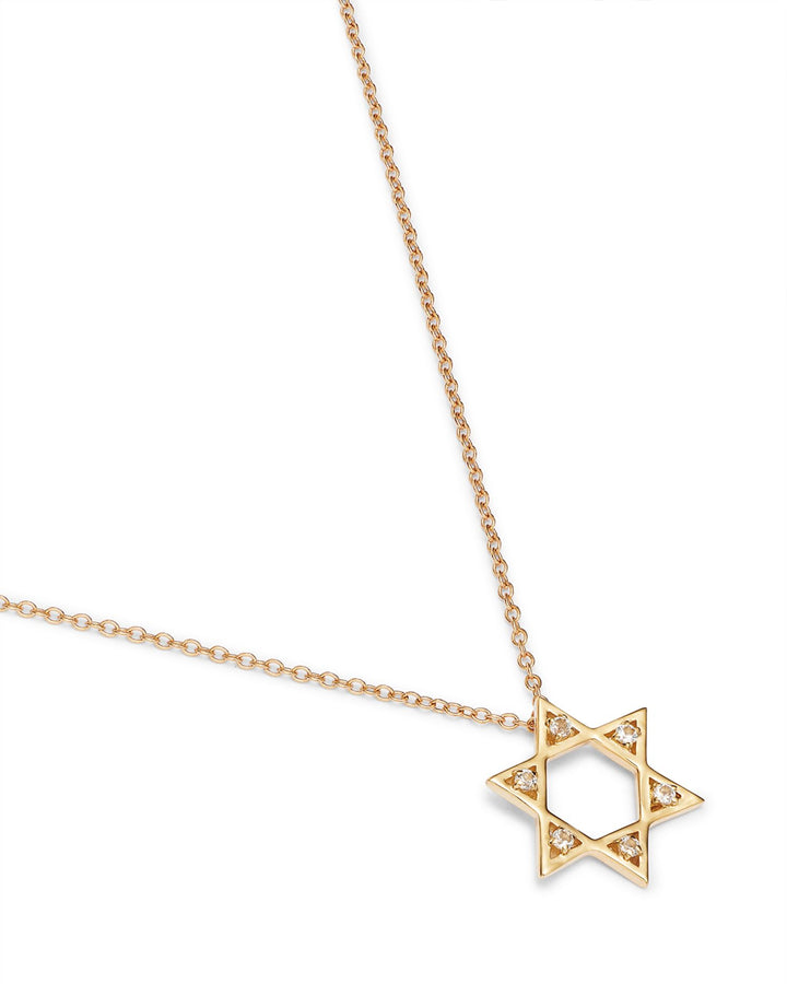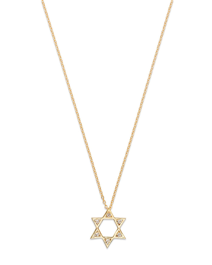 This 14K Yellow Gold White Topaz Star of David Pendant Necklace by Moon & Meadow features a sparkling white topaz set on an elegant Star of David pendant. The simple yet meaningful design makes this necklace a timeless piece that can be worn for both spiritual and stylish purposes.