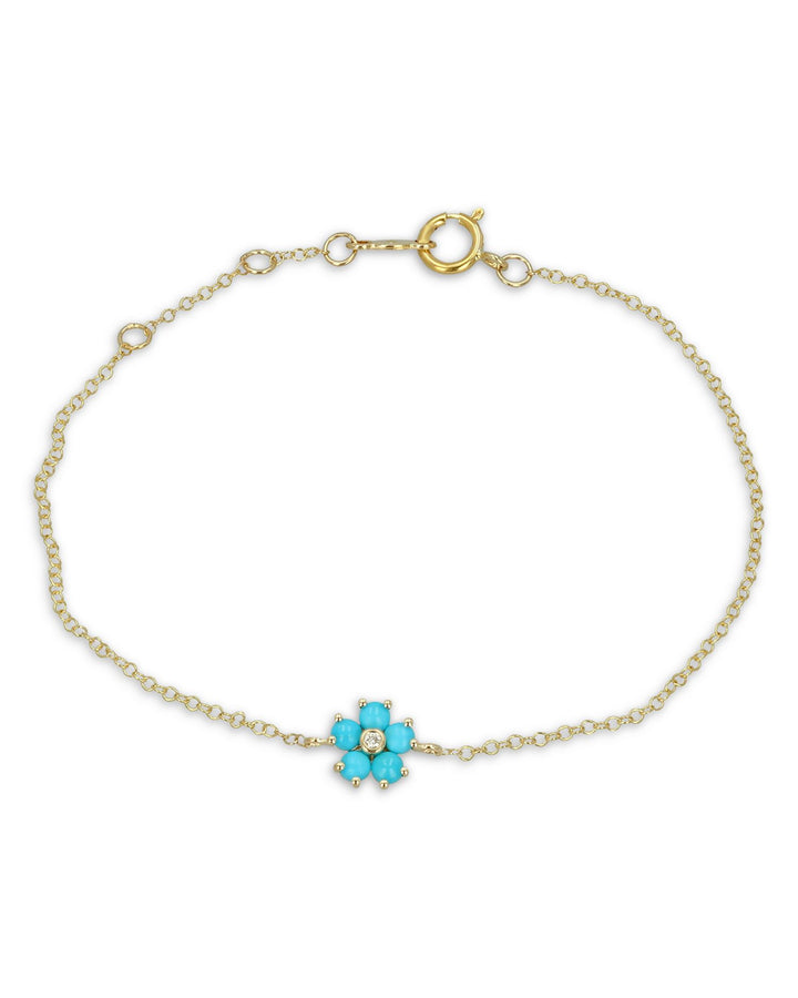 This 14K Yellow Gold Turquoise & Diamond Pendant Bracelet by Moon & Meadow features a vibrant turquoise flower pendant with a sparkling diamond center. The bracelet adds a pop of color and elegance, perfect for both casual and formal styles.