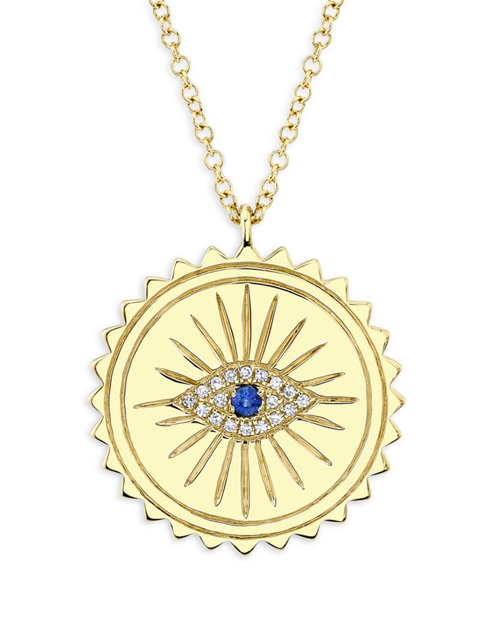 This 14K Yellow Gold Diamond & Sapphire Eye Pendant Necklace by Moon & Meadow features a mystical design, with a sapphire at the center surrounded by diamonds. The eye motif represents protection and good fortune, making this necklace a symbolic piece as well as a stylish one. Its adjustable length and elegant design make it perfect for layering or wearing solo.