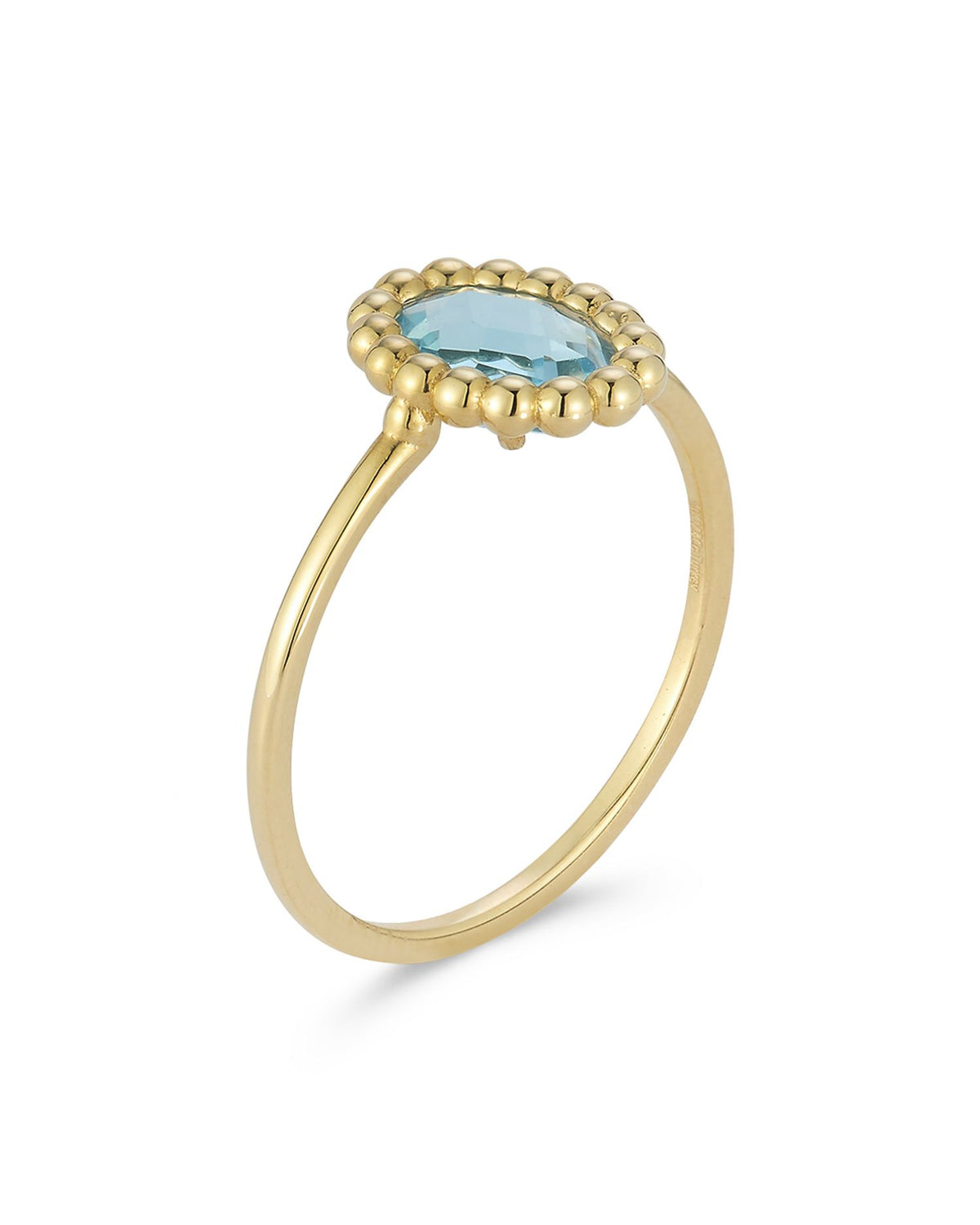 This 14K Yellow Gold Blue Topaz Solitaire Ring by Moon & Meadow showcases a stunning blue topaz set in a beaded frame of 14K yellow gold. The icy blue stone captures light beautifully, creating an eye-catching piece that exudes elegance. Perfect for both casual and formal wear, this ring is a timeless addition to any jewelry collection.