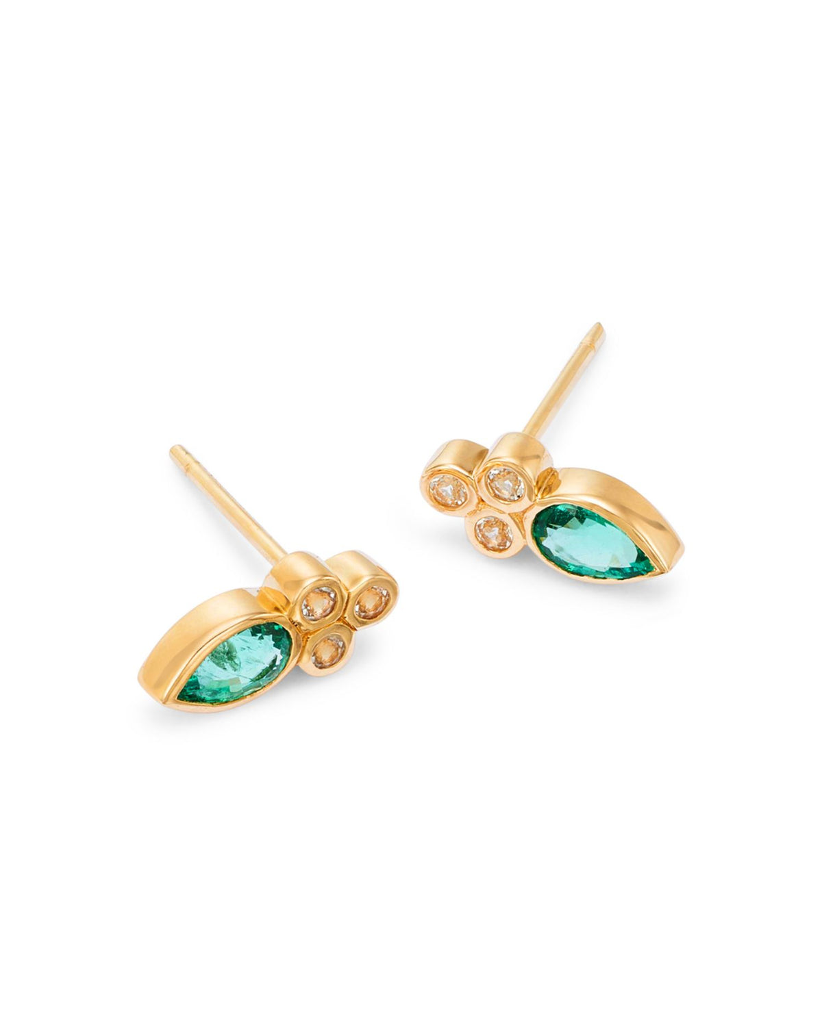 These 14K Yellow Gold Emerald & White Topaz Bezel Stud Earrings by Moon & Meadow whisk you away to the rich green pools of Italy's Emerald Grotto. The stunning pear-cut emeralds are bezel-set and accented with dazzling triple white topaz, creating a piece that captures both sophistication and vibrant color. These earrings are perfect for adding a luxurious touch to any look.