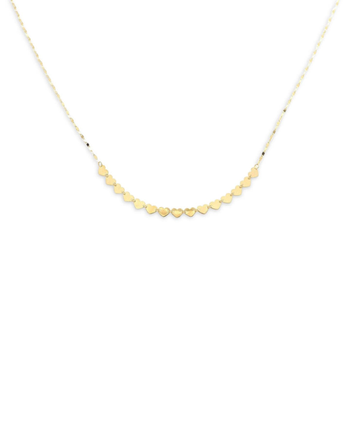 This 14K Yellow Gold Heart Curved Bar Necklace by Moon & Meadow features a curved bar of polished hearts, symbolizing love and affection. This delicate necklace adds a sweet and romantic touch to your jewelry collection, making it perfect for layering or wearing solo. Its minimalist design makes it versatile for both casual and formal looks.