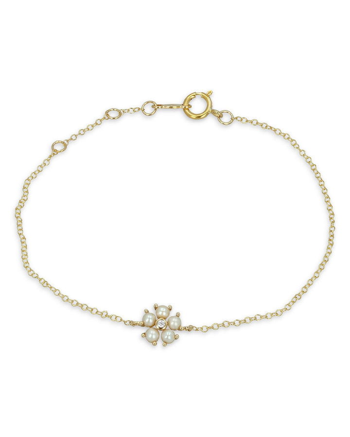 This 14K Yellow Gold Cultured Freshwater Pearl & Diamond Bracelet by Moon & Meadow combines timeless elegance with a delicate flower pendant crafted from cultured freshwater pearls and accented with a sparkling diamond center. A refined design perfect for any occasion.