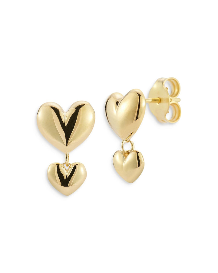 These 14K Yellow Gold Double Heart Drop Earrings by Moon & Meadow invoke love and style with their dual-heart design in polished 14K yellow gold. The sweet and elegant design makes them perfect for adding a romantic touch to any outfit. These earrings are versatile enough to be worn every day or for special occasions, making them a thoughtful gift for someone special.