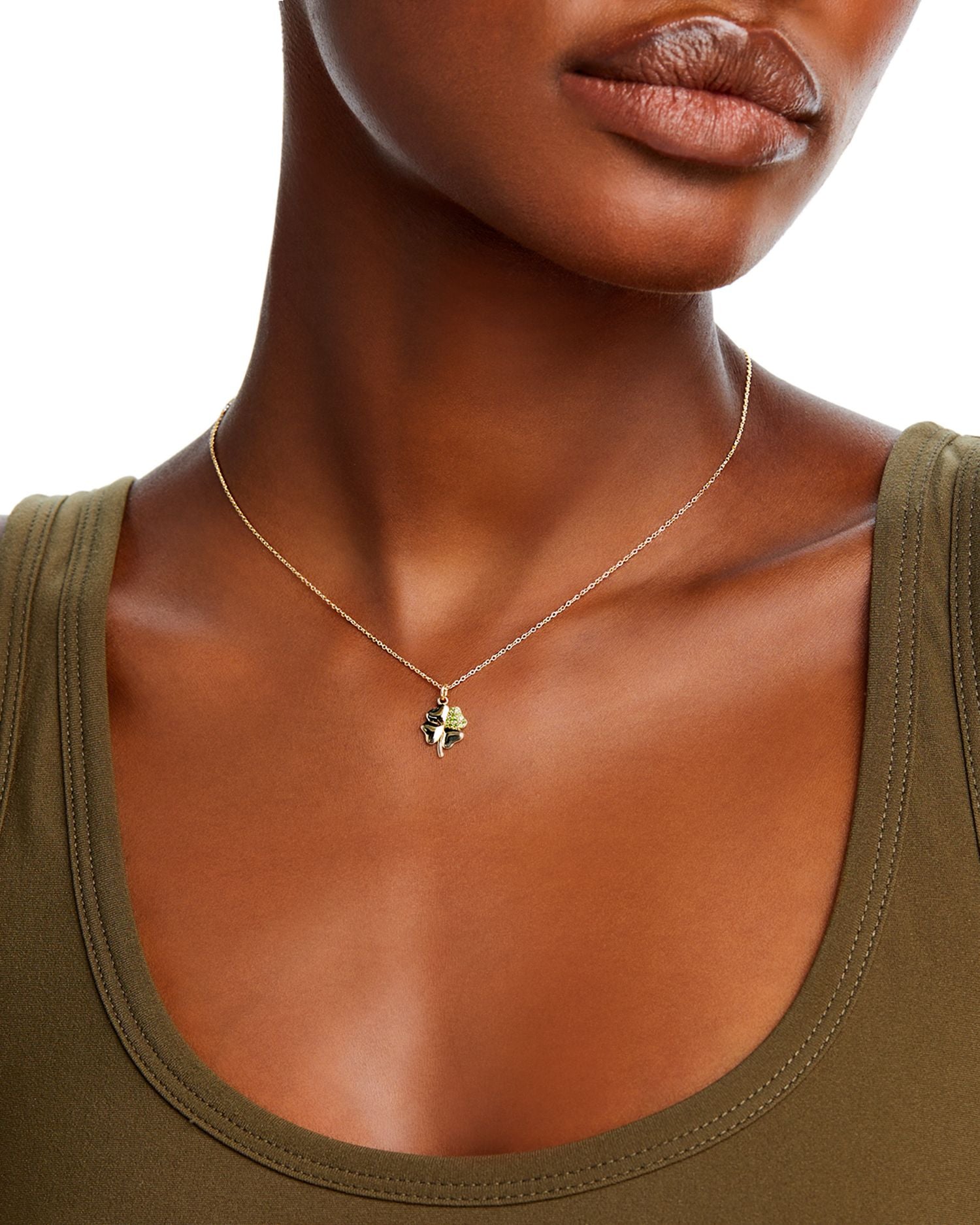 Handcrafted in 14K yellow gold with green diopside. Adjustable 16'-18' length; pendant measures 0.47' in length. Spring ring closure. Almost all gemstones and blue and black diamonds have been treated to enhance their beauty and require special care.