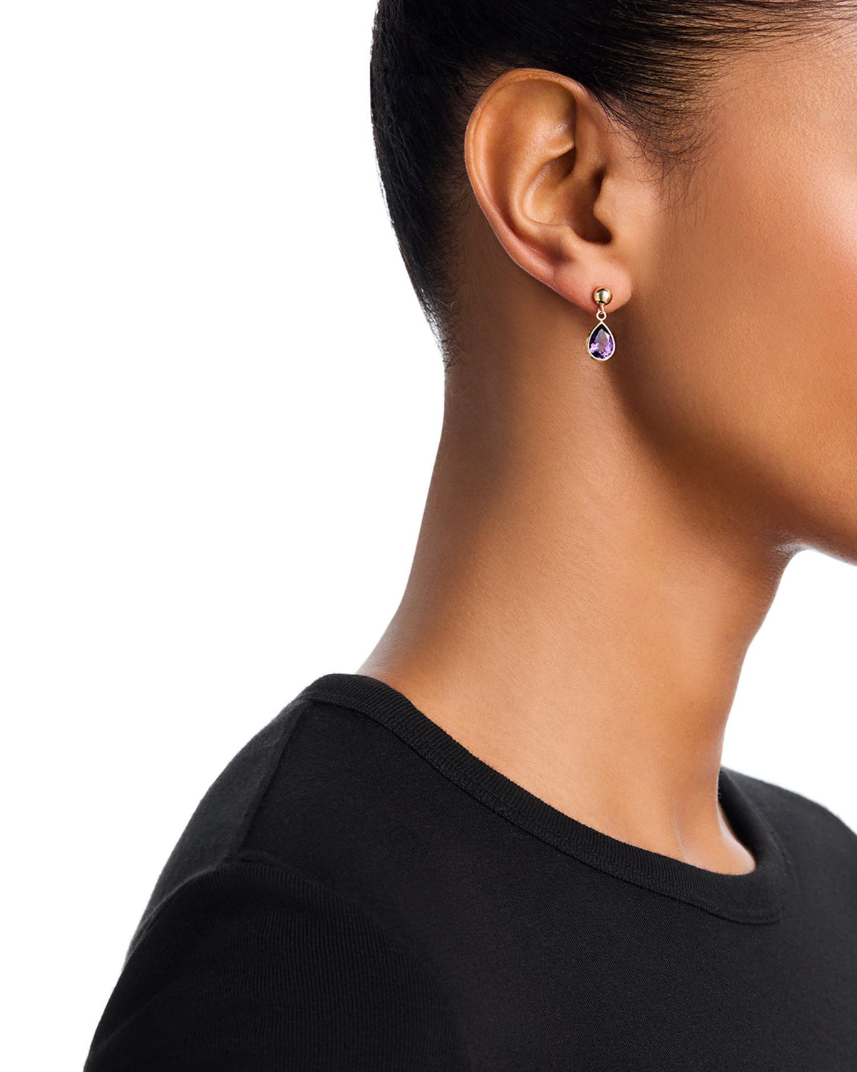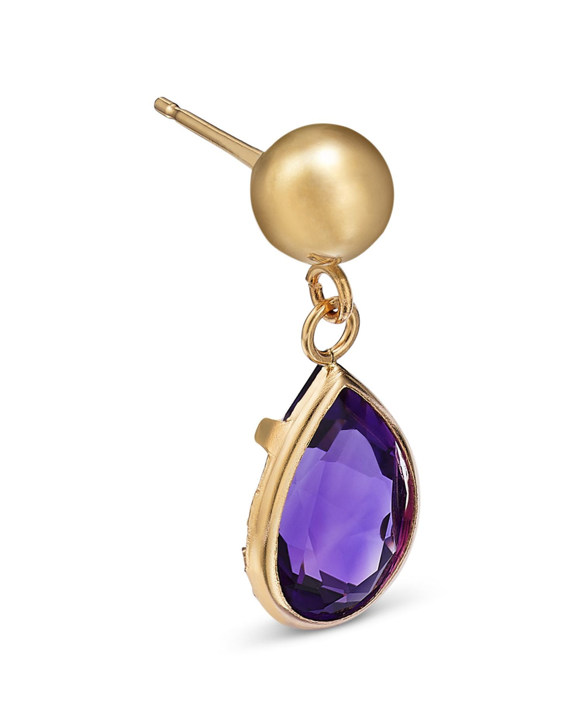 These 14K Yellow Gold Amethyst Drop Earrings by Moon & Meadow feature teardrop-shaped amethyst stones, set in polished 14K yellow gold. The deep purple hue of the amethyst adds a regal touch, making these earrings perfect for adding a pop of color and elegance to any outfit.