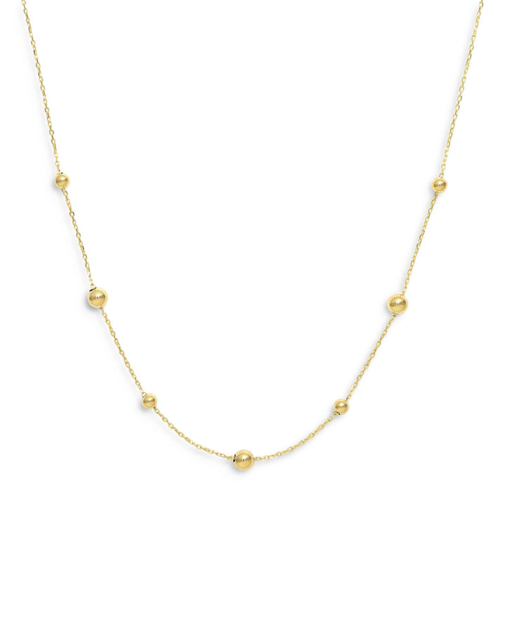This 14K Yellow Gold Beaded Station Necklace by Moon & Meadow features delicate 14K yellow gold beads arranged along a fine chain. The beaded stations add texture and elegance to the necklace, making it perfect for layering or wearing alone for a subtle statement.