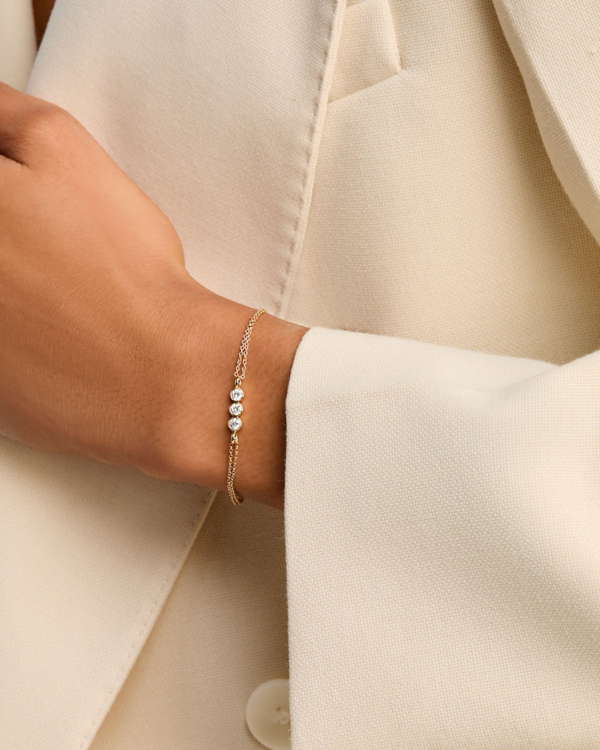 This 14K Yellow Gold Lab Grown Diamond Trio Bezel Chain Bracelet by Moon & Meadow combines the brilliance of lab-grown diamonds with the timeless beauty of yellow gold. Three bezel-set diamonds sit gracefully on a double strand bracelet, offering a subtle sparkle that’s perfect for both everyday wear and special occasions. The quality and shine of lab-grown diamonds mirror those of natural diamonds, making this a contemporary yet luxurious piece.