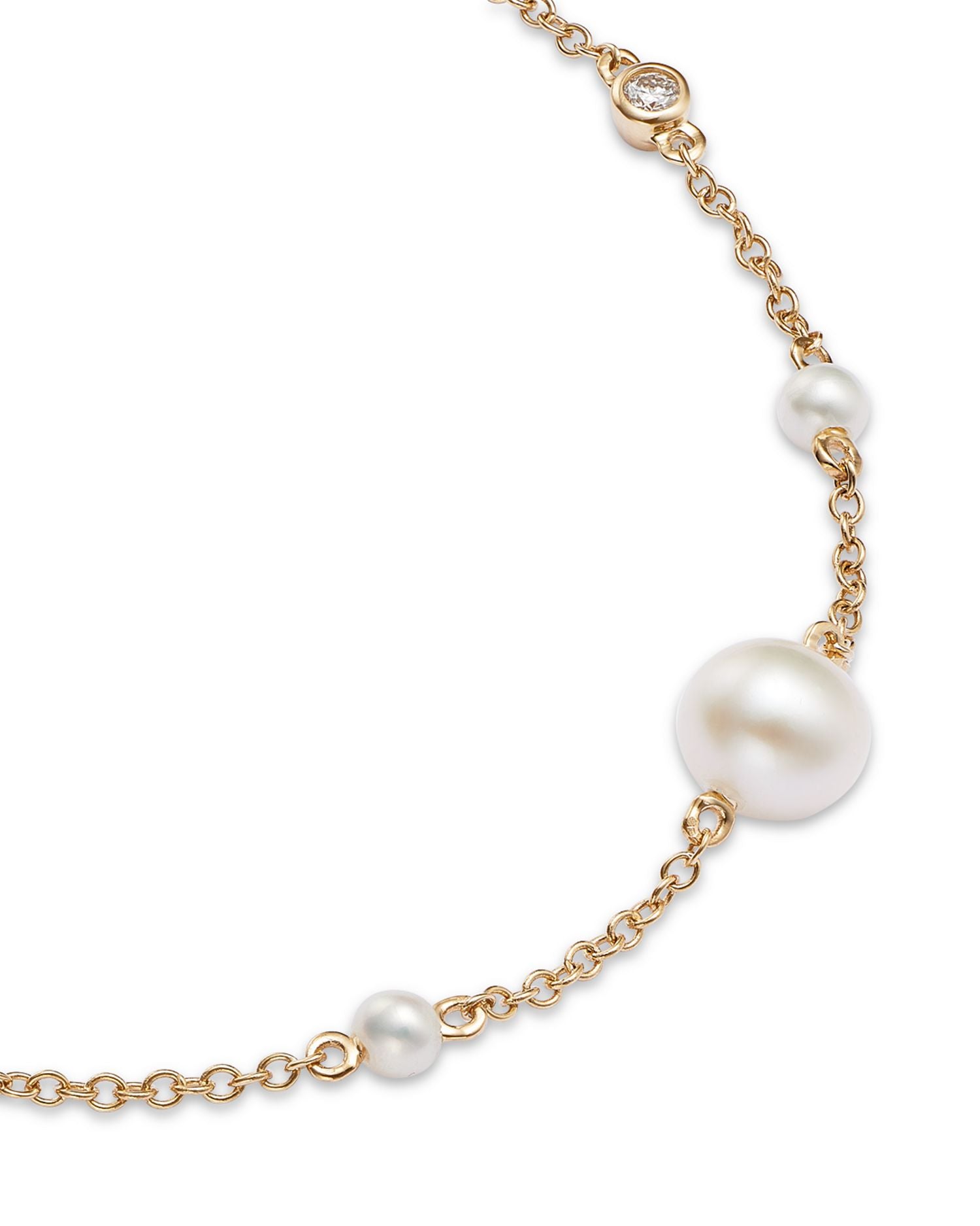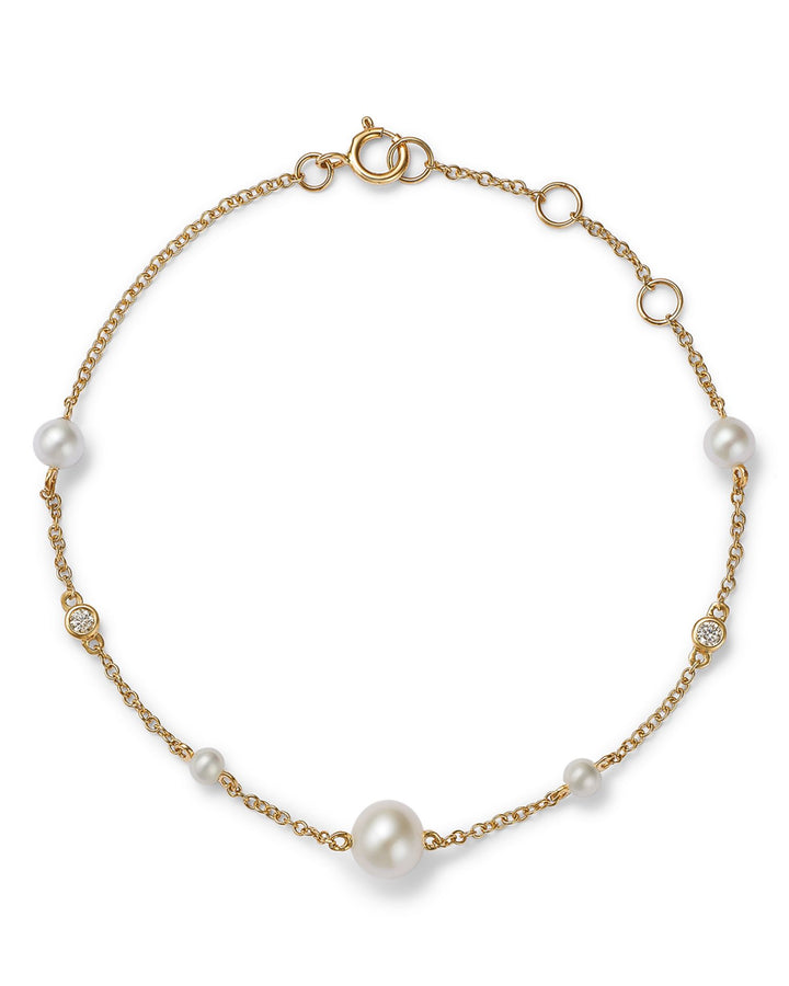 This 14K Yellow Gold Cultured Freshwater Pearl & Diamond Station Link Bracelet by Moon & Meadow blends delicate elegance with a modern touch, featuring mixed cultured freshwater pearls and sparkling diamond accents. A refined design for any occasion.