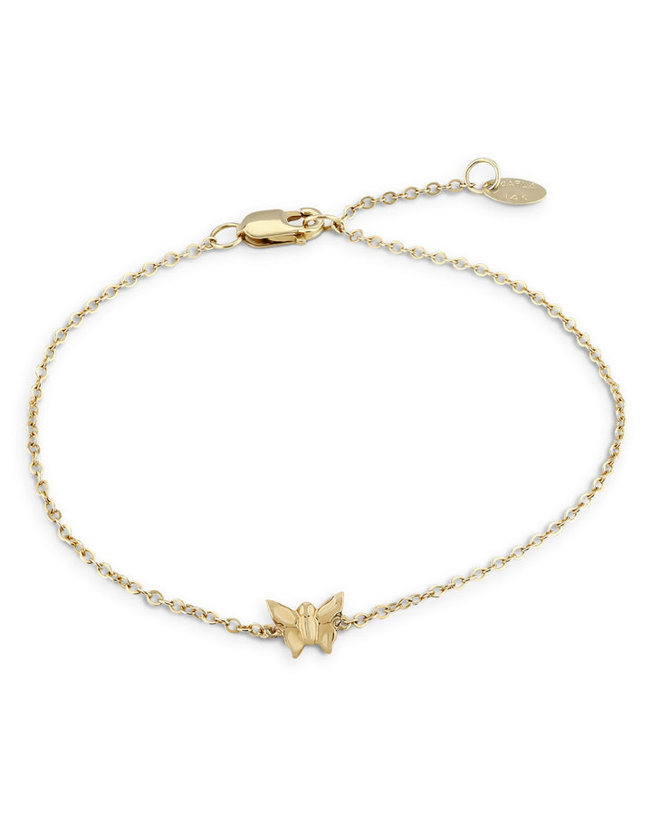 This 14K Yellow Gold Butterfly Chain Bracelet by Moon & Meadow adds a whimsical touch to any outfit. The delicate butterfly motifs are linked together to create a charming and lighthearted design. Crafted in polished 14K yellow gold, this bracelet is perfect for adding a bit of elegance and fun to your look. The 7-7.5' length and lobster clasp closure ensure a secure and comfortable fit.