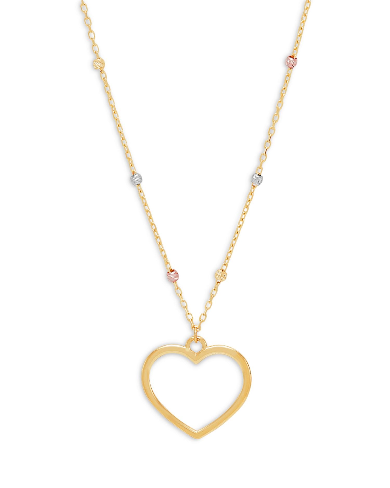 This 14K Yellow Gold Open Heart Pendant Necklace by Moon & Meadow features a shining open heart pendant accented by bead details on the chain. The heart is crafted in 14K yellow gold, while the beads feature a mix of 14K yellow gold, 14K white gold, and 14K rose gold, creating a multi-tonal effect. The 17.75' chain and spring ring clasp closure ensure a comfortable and secure fit.