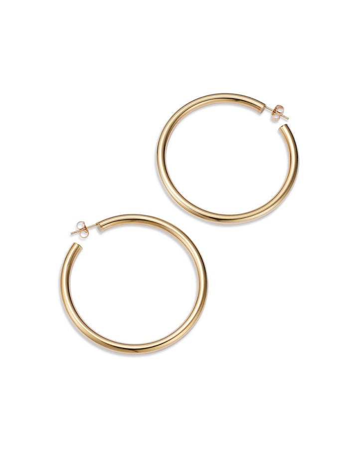 Handcrafted in 14K yellow gold, available in 25mm or 50mm diameter, 4mm width. Features a post back closure.