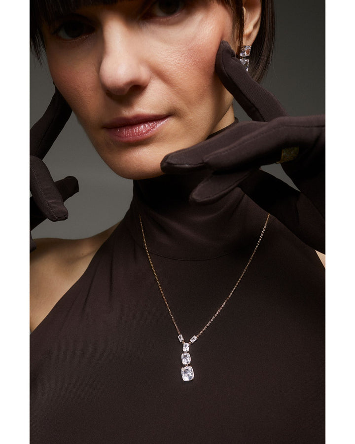 This Mixed Cut Cubic Zirconia Lariat Necklace by Nadri is a sophisticated accessory featuring a variety of cuts for a dazzling effect. Its adjustable length and sliding bead make it a versatile piece for layering or standalone wear.