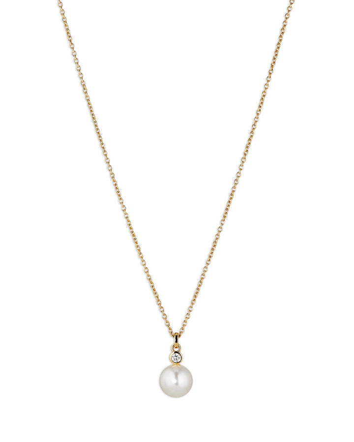 Crafted in silver-tone or 18K gold-plated brass with cubic zirconia and a nacre pearl. Adjustable length measures 16'-18' with a 0.62' pendant drop. Secured with a spring ring closure.