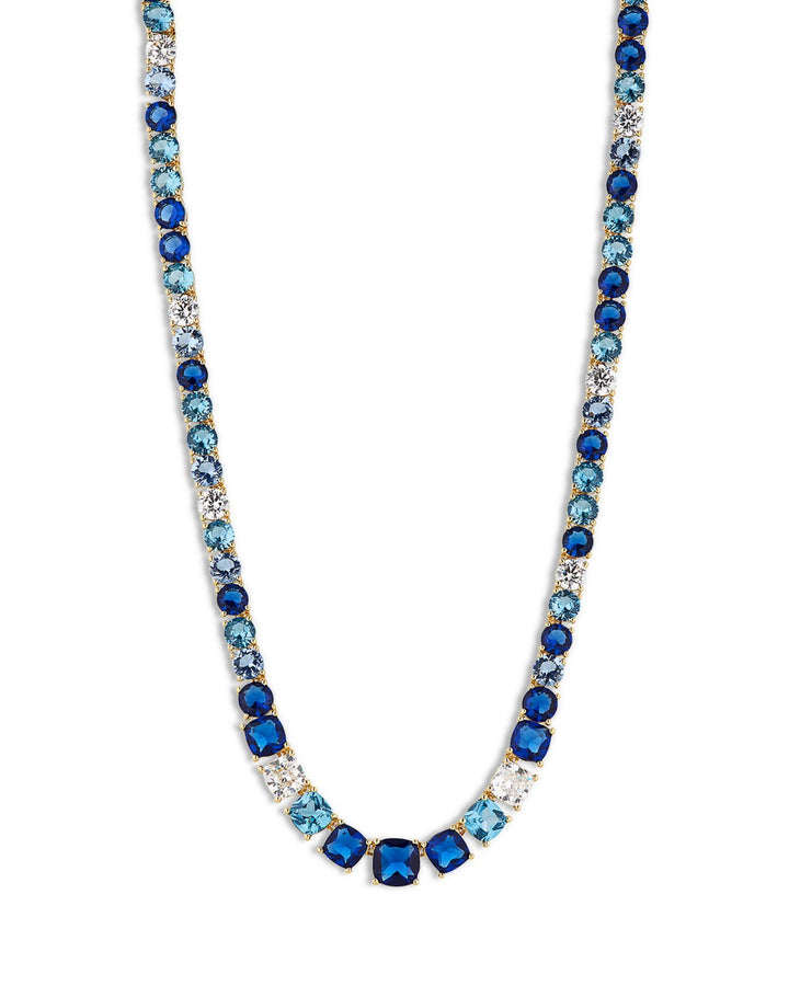 Crafted in 18K gold-plated brass with cubic zirconia, glass, and synthetic spinel. Measures 16"L and secures with a foldover clasp closure.