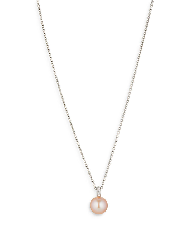 Crafted in rhodium-plated sterling silver with cubic zirconia accents and an 8-8.5mm cultured freshwater pearl. Measures 16'L with a 2' extension and a 0.5'L pendant. Secured with a spring ring closure.