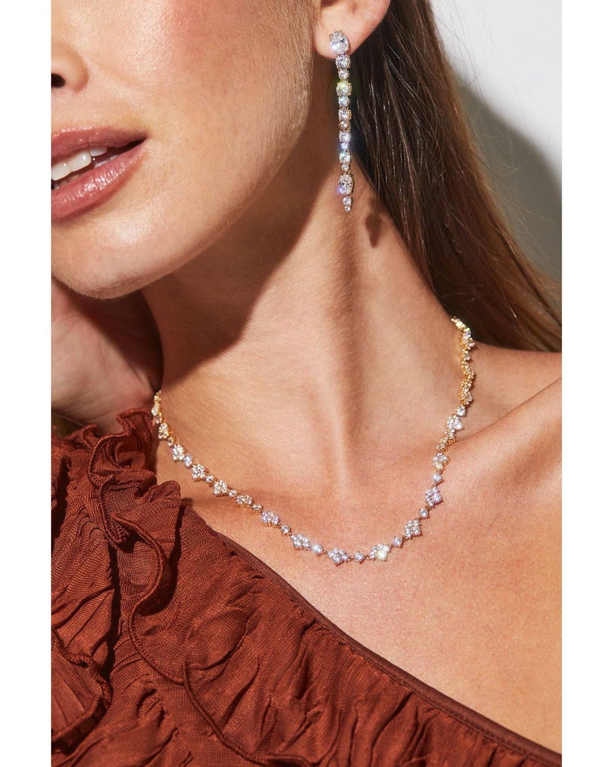 This Lace Collar Necklace by Nadri exudes timeless elegance with its intricate lace-inspired design and sparkling cubic zirconia. Perfect for formal occasions or adding a statement to evening wear.