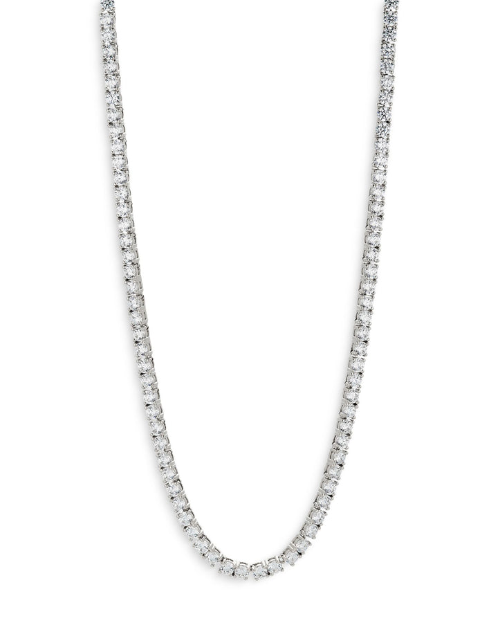 Crafted in rhodium-plated or 18K gold-plated brass with cubic zirconia accents. Measures 24"L and 3mm wide. Secured with a box clasp closure.