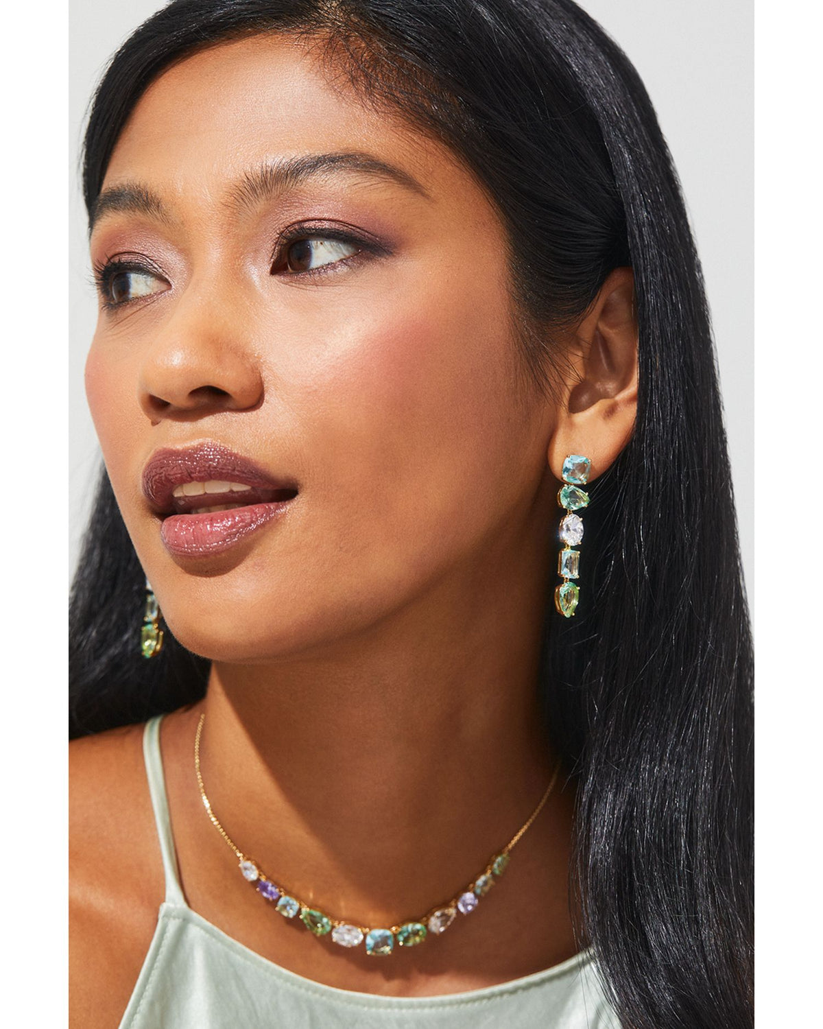 These Watercolor Linear Mixed Cut Drop Earrings by Nadri are a vibrant and luxurious accessory. Featuring a linear design with mixed-cut cubic zirconia and colorful glass stones, they add dynamic elegance to formal or festive looks.