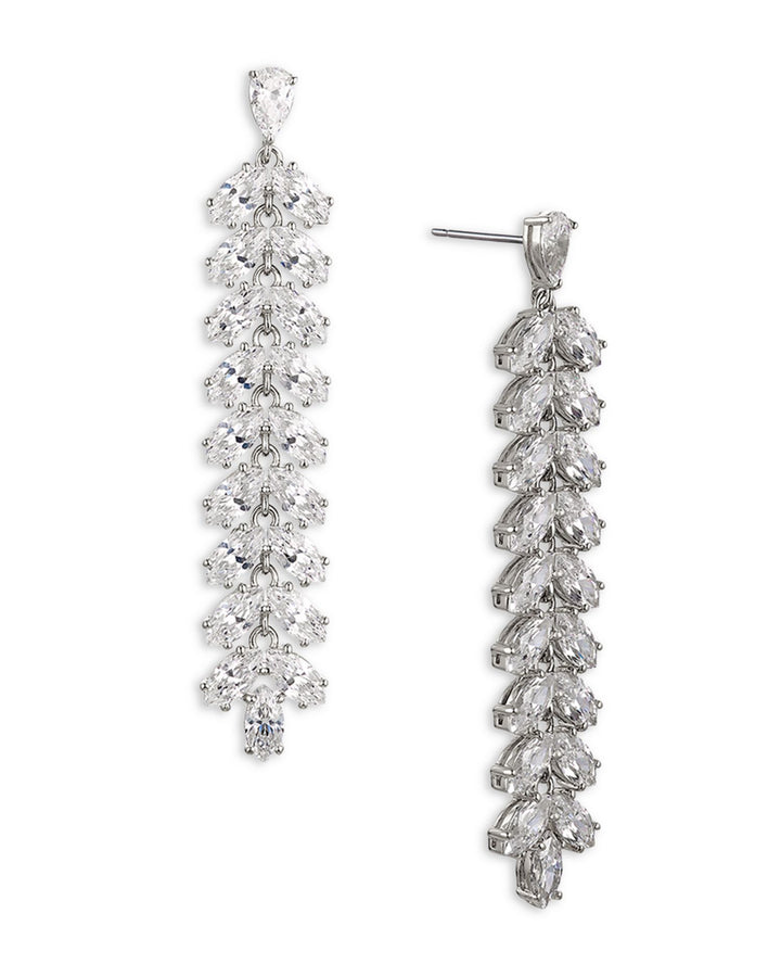 These RSVP Crystal Leaf Linear Earrings by Nadri from the RSVP collection are a glamorous and feminine accessory. Featuring cascading leaf motifs with shimmering cubic zirconia, they are perfect for weddings or formal events.