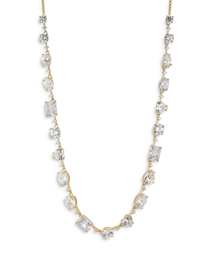 Made in 18K gold-plated brass with cubic zirconia accents. Measures 16'L with a 2' extender and features a lobster clasp with an adjustable sliding closure.