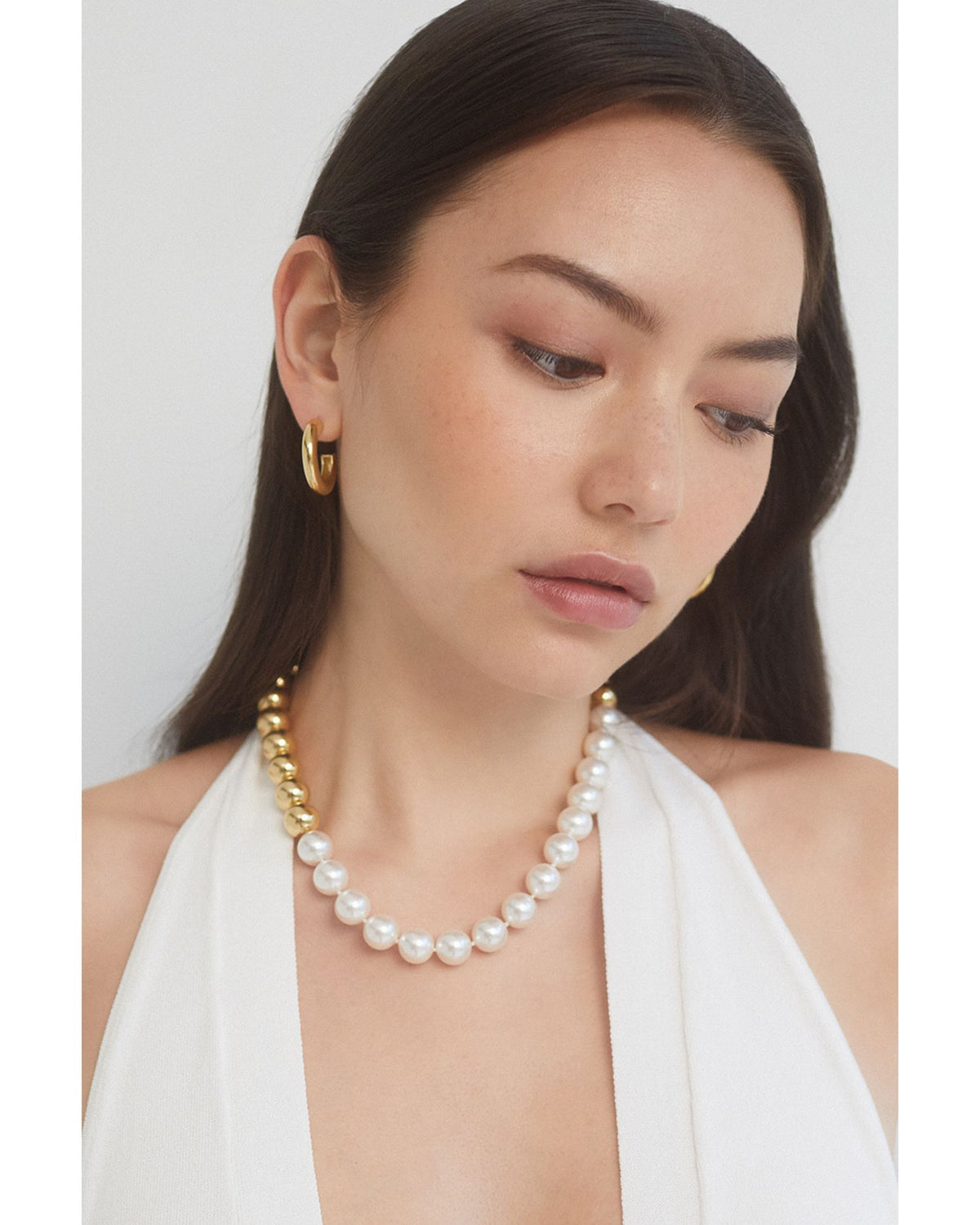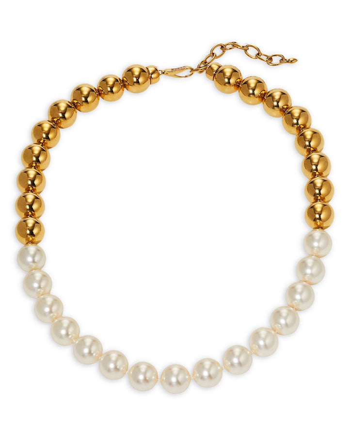 Designed in 18K gold-plated brass with glass pearl accents. Measures 19" in adjustable length and secures with a lobster clasp closure.