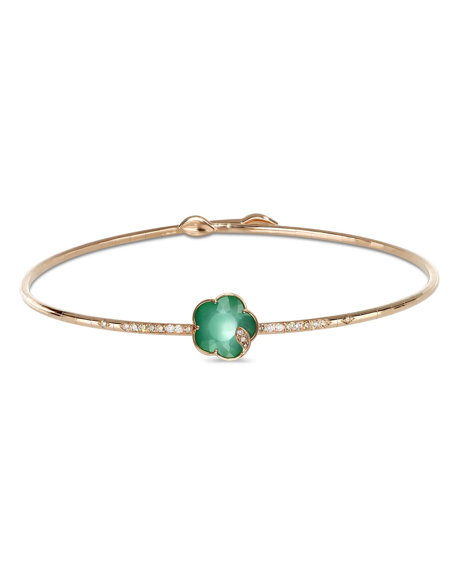 Made in 18K rose gold with white diamonds (0.09 ct. t.w.) and champagne diamonds (0.29 ct. t.w.), green agate, white moonstone, and mother of pearl. Choker diameter: 3.94"; pendant length: 0.47". Flex adjustable closure. All gemstone carat weights (ct. t.w.) are approximate, with a variance of 0.05 carat. Made in Italy.