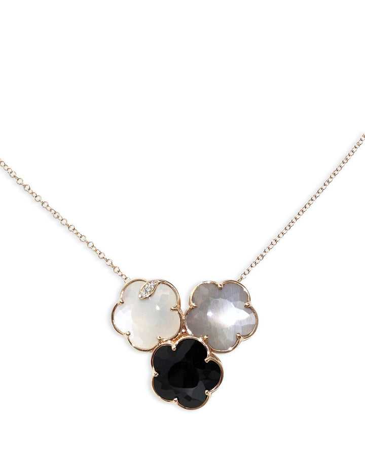 This Bouquet Lunaire Multi Stone & Diamond Flower Pendant Necklace by Pasquale Bruni brings a whimsical charm to your collection. Featuring a trio of flowers crafted from onyx, gray moonstone, and white moonstone, the design is accented with delicate diamonds. A beautiful piece to add a playful yet elegant touch to your look.