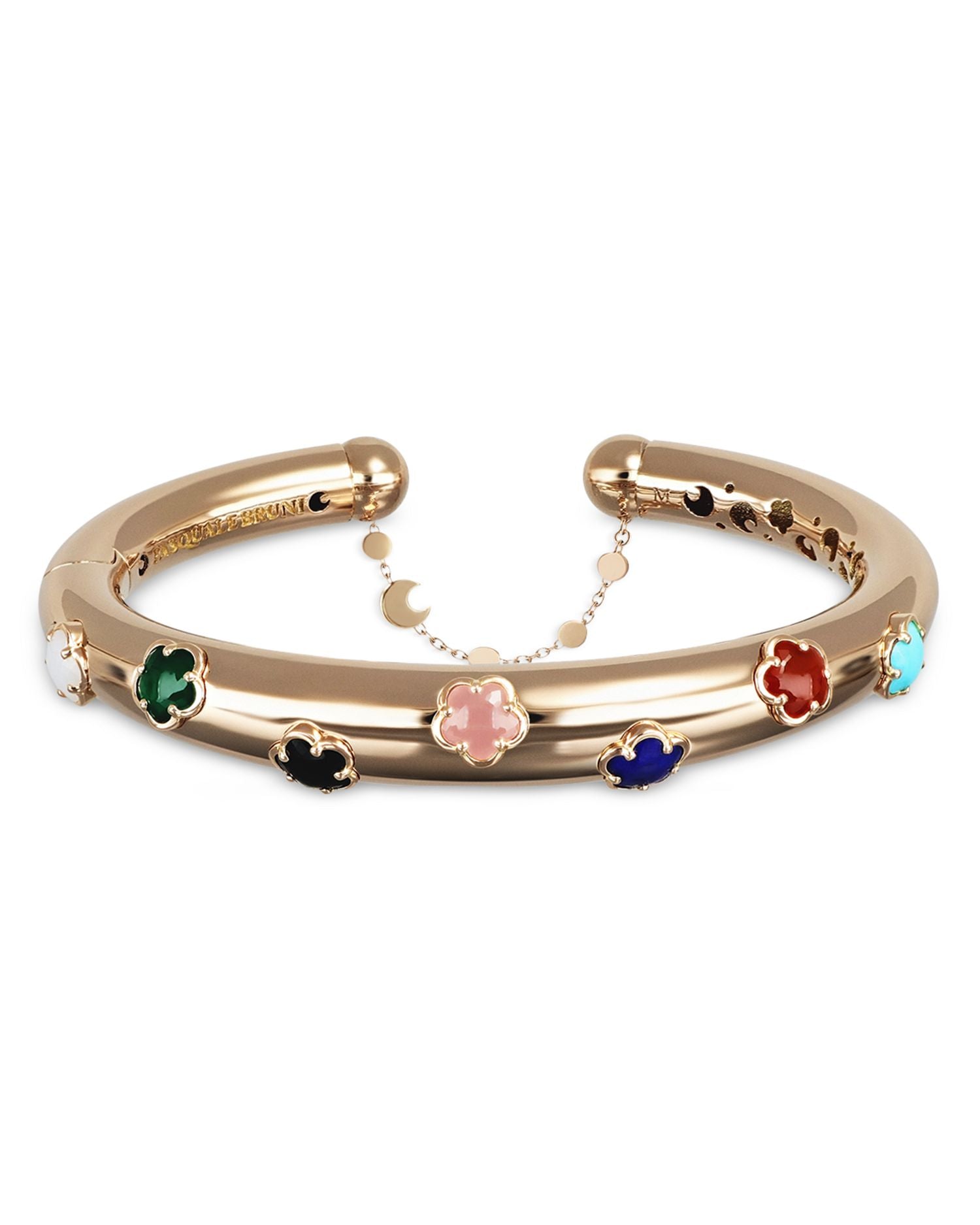 This 18K Rose Gold Luna in Fiore Bracelet with Rainbow Gemstones & Diamonds by Pasquale Bruni from the Luna in Fiore Collection is a vibrant celebration of color and craftsmanship. The floral motif features an array of rainbow gemstones and delicate diamond detailing, making it a striking statement piece.