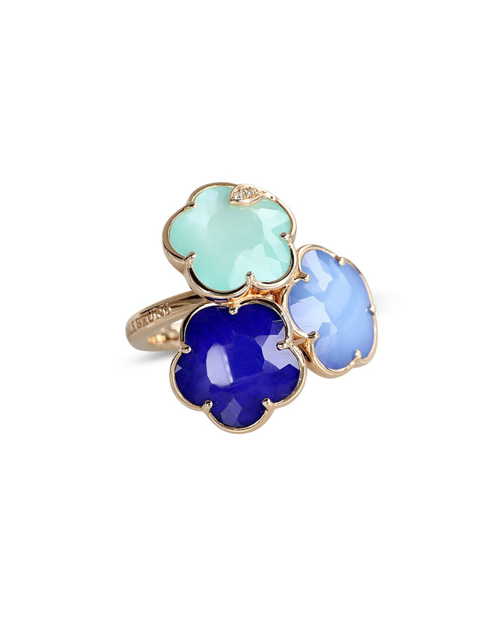 This Petit Joli Multi Stone & Diamond Flower Statement Ring by Pasquale Bruni is a vibrant celebration of nature. The bold floral design features a cluster of blue-hued stones, including white agate and lapis lazuli doublets, turquoise and moonstone doublets, and lapis lazuli and rock crystal doublets, accented with white and champagne diamonds. A statement piece for those who embrace color and elegance.