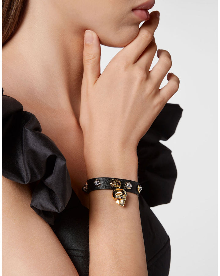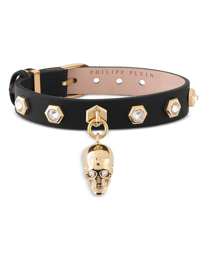 This 3D $kull Crystal Studded Leather Bracelet by Philipp Plein from the 3D $kull Collection exudes a daring edge with its bold design. Gold-tone detailing and Swarovski crystals accentuate the leather strap for a modern and stylish statement piece.
