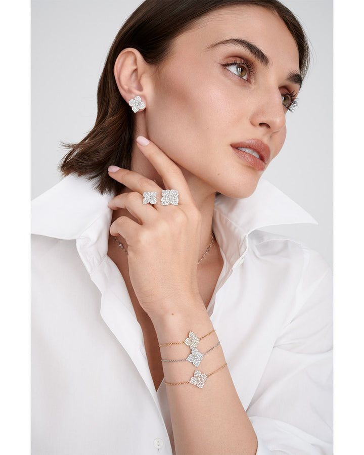This Fiore Bracelet with Diamonds by Piranesi is a stunning example of timeless elegance. The breathtaking floral pendant, encrusted with pavé diamonds, graces a delicate yellow gold chain. Perfect for adding a refined sparkle to your wrist.