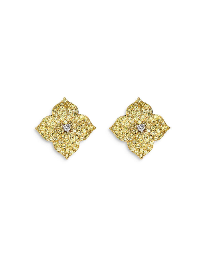 These Small Fiore Earrings with Yellow Sapphires and Diamonds by Piranesi are a delicate floral design that radiates charm. Featuring bright yellow sapphire pavé and a center diamond, these stud earrings bring a touch of warmth and elegance to any outfit.