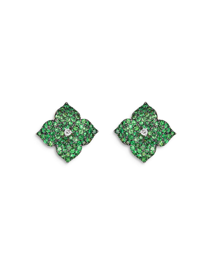 These Small Fiore Earrings with Green Tsavorite Garnets and Diamonds by Piranesi are a delicate and elegant floral design. Featuring vibrant green tsavorite garnets and a center diamond, these earrings radiate timeless sophistication.